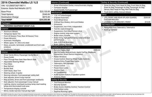 CARFAX One-Owner. Clean CARFAX. 2016 Chevrolet Malibu LS 1LS Butte Red Metallic 6-Speed Automatic 1.5L DOHC One Owner, Clean Carfax History Report, 16" Aluminum Wheels, AM/FM radio, Apple CarPlay/Android Auto, Exterior Parking Camera Rear, Remote keyless entry, Remote Start Kit (LPO), Speed control. 27/37 City/Highway MPG