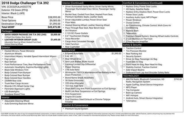 2018 Dodge Challenger T/A 392 F8 Green 8-Speed Automatic SRT HEMI 6.4L V8 MDS Apple Car Play, Android Auto, Heated Front Seats, Heated Steering Wheel, Leather Interior Group, Power Tilt/Telescope Steering Column, Quick Order Package 24X T/A 392, T/A Nappa/Alcantara Seat.