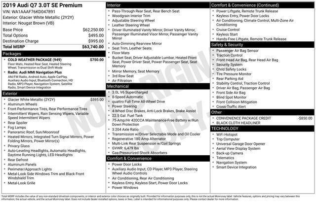 Clean CARFAX. 2019 Audi Q7 55 SE Premium quattro Glacier White 8-Speed Automatic with Tiptronic 3.0L TFSI V6 DOHC Clean Carfax History Report, 3rd row seats: bench, AM/FM radio: SiriusXM, Audi smartphone interface (Apple CarPlay/Android Auto), Cold Weather Package, Front fog lights, Heated front seats, Heated Rear Seats, Memory seat, Power driver seat, Power Liftgate, Power moonroof, Power passenger seat, Remote keyless entry, Speed control, Wheels: 20" 10-Spoke-Star Design Bi-Color.