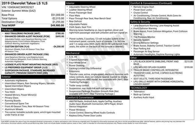 2019 Chevrolet Tahoe LS Summit White 6-Speed Automatic Electronic with Overdrive EcoTec3 5.3L V8 3.42 Rear Axle Ratio, 3rd Row Passenger Seat Delete, AM/FM radio: SiriusXM, Apple CarPlay/Android Auto, Bluetooth® For Phone, Custom Edition, Enhanced Driver Alert Package, Exterior Parking Camera Rear, Integrated Trailer Brake Controller, Max Trailering Package, Power driver seat, Power passenger seat, Remote keyless entry, Remote Vehicle Start, Speed control, Standard Suspension Package, Wheels: 18" x 8.5" Painted Aluminum.
