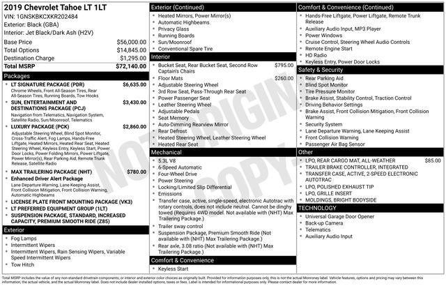 CARFAX One-Owner. Clean CARFAX. 2019 Chevrolet Tahoe LT Black 6-Speed Automatic Electronic with Overdrive EcoTec3 5.3L V8 One Owner, 3.42 Rear Axle Ratio, 3rd Row 60/40 Power Fold Split-Bench, AM/FM radio: SiriusXM, Apple CarPlay/Android Auto, Bluetooth® For Phone, Bose Premium 9-Speaker System, Exterior Parking Camera Rear, Fog Lamps, Front & Rear Park Assist, Heated 2nd Row Seats, Heated front seats, Heated Leather Wrapped Steering Wheel, Integrated Trailer Brake Controller, Lane Change Alert w/Side Blind Zone Alert, LT Signature Package, Luxury Package, Max Trailering Package, Memory Settings, Power driver seat, Power Liftgate, Power passenger seat, Power Release 2nd Row Bucket Seats, Power Sunroof, Radio: Chevrolet Infotainment AM/FM Stereo w/Nav, Rear Cross Traffic Alert, Rear Seat Blu-Ray/DVD Entertainment System, Remote keyless entry, Remote Vehicle Start, Speed control, Standard Suspension Package, Sun, Entertainment & Destinations Package, Wheels: 20" x 9" Chrome.