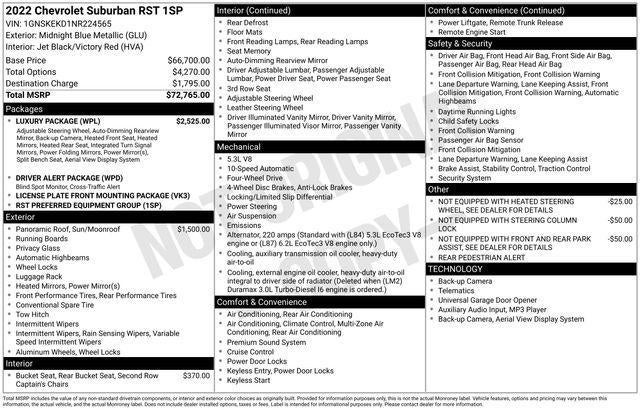 CARFAX One-Owner. 2022 Chevrolet Suburban RST Midnight Blue Metallic 10-Speed Automatic with Overdrive EcoTec3 5.3L V8 3rd Row 60/40 Power-Folding Split-Bench, AM/FM radio: SiriusXM with 360L, Apple CarPlay/Android Auto, Bose 9-Speaker Stereo Audio System Feature, Driver Alert Package, Dual-Pane Power Panoramic Sunroof, Front & Rear Park Assist, HD Surround Vision, Heated 2nd Row Outboard Seats, Heated Driver & Front Passenger Seats, Heated Steering Wheel, Lane Change Alert w/Side Blind Zone Alert, Luxury Package, Memory seat, Power driver seat, Power Liftgate, Power Release 2nd Row Bucket Seats, Remote keyless entry, Speed control, Wheels: 22" x 9" Bright Machined.