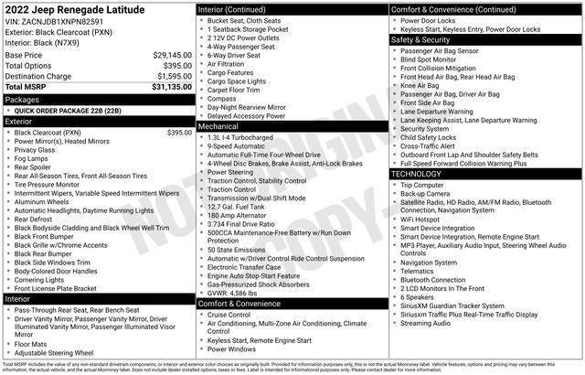 CARFAX One-Owner. 2022 Jeep Renegade Latitude Black Clearcoat 9-Speed 948TE Automatic 1.3L I4 One Owner, 17" x 7.0" Aluminum Wheels, AM/FM radio: SiriusXM, Apple CarPlay/Android Auto, Front fog lights, ParkView Rear Back-Up Camera, Remote keyless entry, Speed control. 23/29 City/Highway MPG