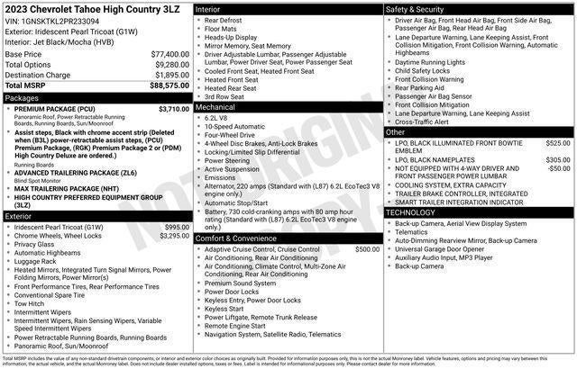 CARFAX One-Owner. Clean CARFAX. 2023 Chevrolet Tahoe High Country Iridescent Pearl Tricoat 10-Speed Automatic with Overdrive EcoTec3 6.2L V8 *GM Certified*, 3rd row seats: split-bench, Adaptive Cruise Control, Advanced Trailering Package, AM/FM radio: SiriusXM with 360L, Apple CarPlay/Android Auto, Black Name Plates (LPO), Bose 10-Speaker Centerpoint Surround Audio Sys Ft, Dual-Pane Power Panoramic Sunroof, Exterior Parking Camera Rear, Heads-Up Display, Heated & Ventilated Driver & Front Passenger Seats, Heated 2nd Row Outboard Seats, Heated Steering Wheel, Integrated Trailer Brake Controller, Lane Change Alert w/Side Blind Zone Alert, Max Trailering Package, Memory seat, Power driver seat, Power Liftgate, Power passenger seat, Power Release 2nd Row Bucket Seats, Power-Retractable Assist Steps, Premium Package, Remote keyless entry, Remote Start, Trailer Side Blind Zone Alert, Wheels: 22" Multi-Spoke Gloss Black (LPO) (SRV).