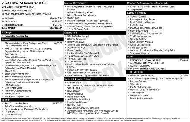 CARFAX One-Owner. Clean CARFAX. 2024 BMW Z4 sDrive M40i Alpine White 8-Speed Automatic Sport 3.0L I6 Apple Car Play, Android Auto, harman/kardon Surround Sound System. 23/31 City/Highway MPG